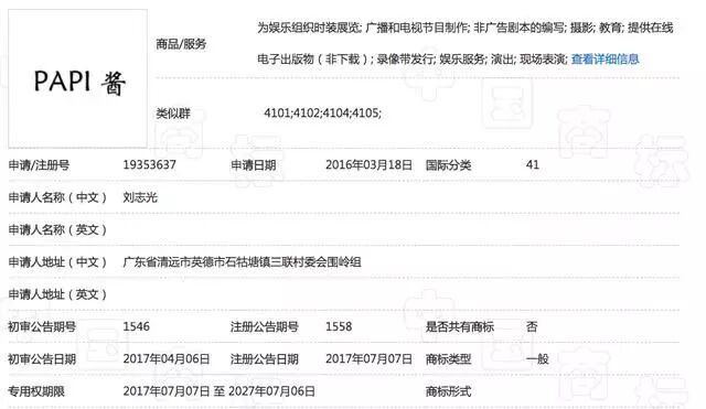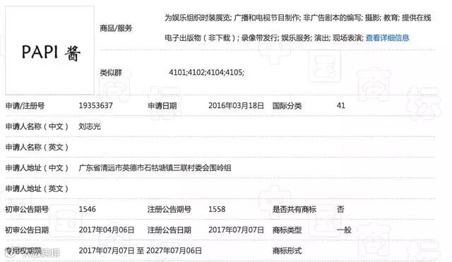 在工商行政管理总局商标局官方网站上,小编输入“papi酱”查询,看到很多类似商标,此次公开出售的两类商标也在其中,其特点是“PAPI”为大写,且和“酱”中间有个空格。资料显示,注册人姓名为刘志光,地址在广东省英德市石牯塘镇三联村委会,正与58同城上的信息相一致。小编继续搜索看到,这位名叫刘志光的人士除了注册有“PAPI 酱”外,还注册了“PAPI”这一商标,后者的类目为29类(果酱奶茶等)和30类(咖啡饮料糖果等)。