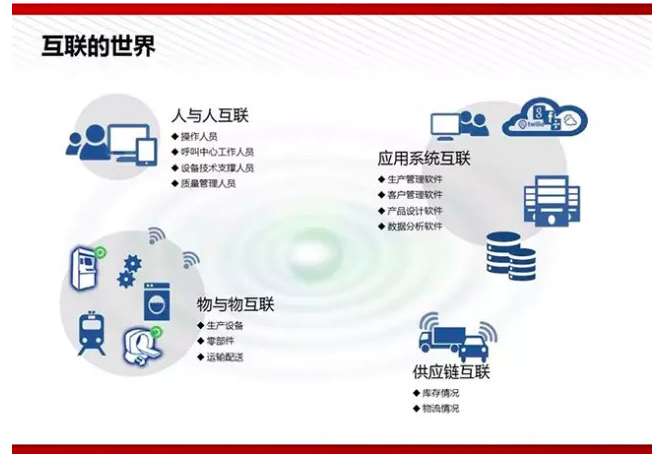 互联网在连接一切过程中,迄今经历了三个阶段。第一阶段是人与信息的互联(代表公司是雅虎谷歌百度新浪);第二阶段是人与人的互联(代表公司是脸谱推特腾讯)和人与商品的互联(代表公司是亚马逊阿里巴巴京东商城);第三阶段刚刚开始,是物与物的互联,代表公司是提出“工业4.0”概念的西门子和提出“工业互联网”概念的GE。