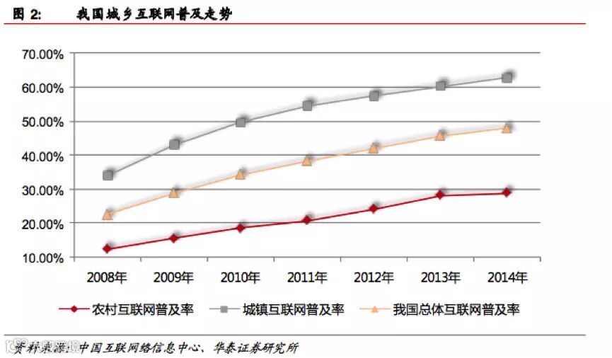基础设施角度: 农村互联网的普及率快速提升,从2008年刚过10%, 快速增长到了2014年底的近30%;互联网设施逐步完善,农村迎来移动互联浪潮;
