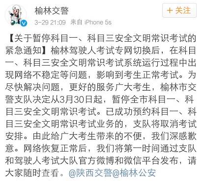 榆林驾驶人考试专网切换后,在科目一、科目三安全文明常识考试系统运行过程中出现网络不稳定等问题,影响到考生正常考试。为尽快解决问题,更好的服务广大考生,榆林市交警支队决定从3月30日起,暂停全市科目一、科目三安全文明常识考试。已成功预约科目一、科目三安全文明常识考试业务的,支队将取消考试安排。