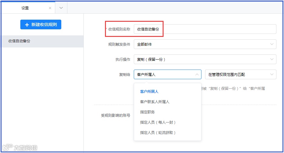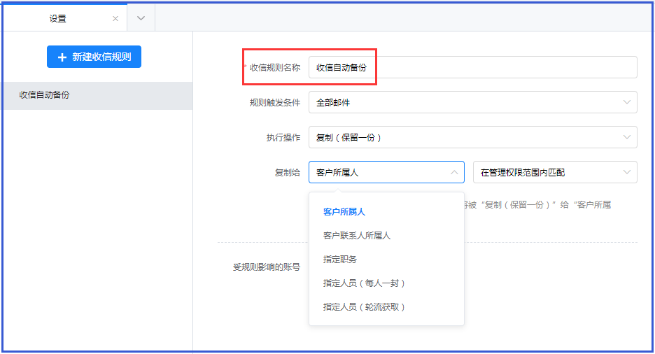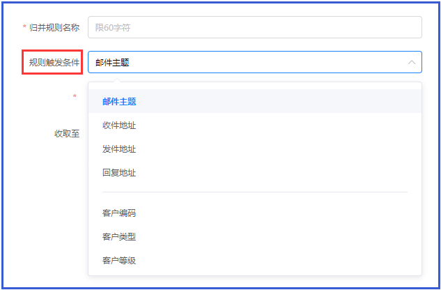2、按照收件地址归并:比如来信的收件地址 123@qq.com,则包含该地址的来信邮箱自动归并至指定客户箱