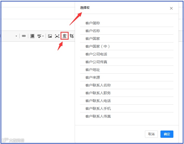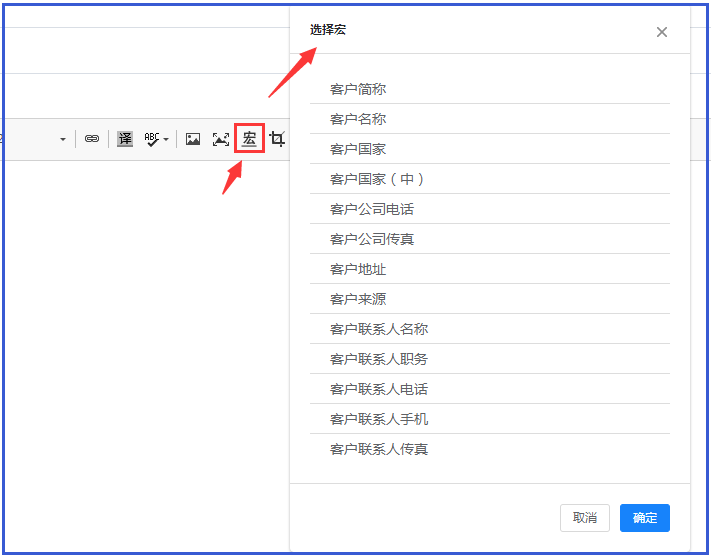 正文编辑时,使用【宏】功能可快速100%匹配性插入客户简称、客户电话、客户地址等内容,客户在收到的邮件中,开篇便是自己的姓名,则可增加邮件打开率,且增强客户信任度。