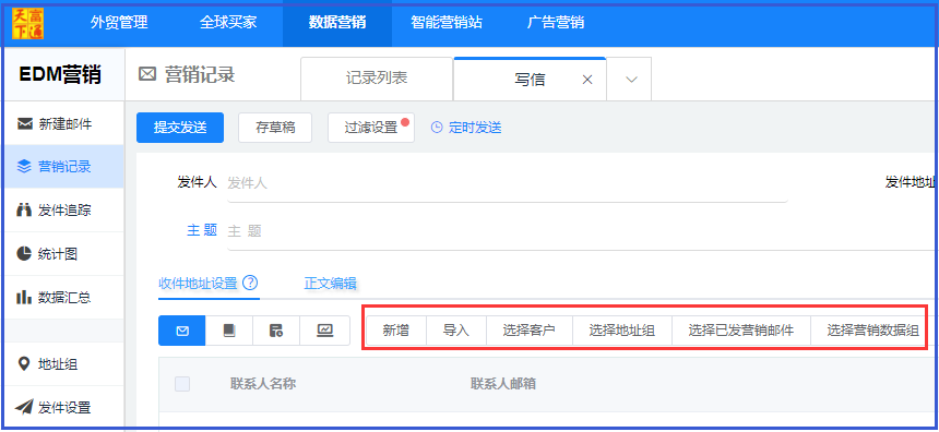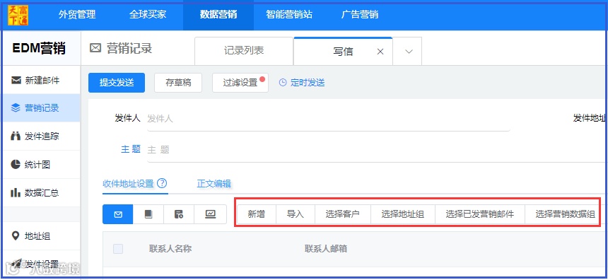 1、当需要进行海量客户开发时,可以使用【EDM】,其优点是一次性发送量大,且可以跟踪送达数、打开数等数据。当用户通过多种方式(单条输入、模板导入、公私海客户、地址组、已发营销件、商业数据)导入邮箱号后,【EDM】可一次性进行快速邮件群发。