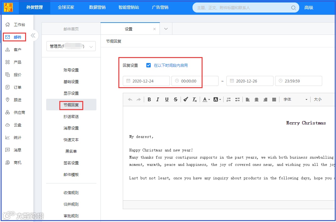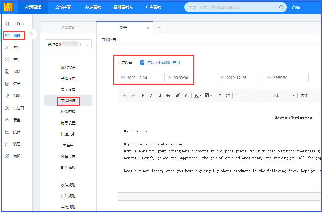 可设置自动发送及回复,无论外出还是节假日,都能及时与客户互动,传递关怀与问候。