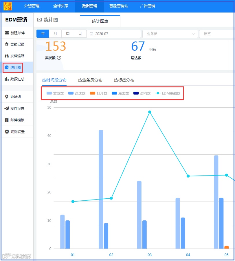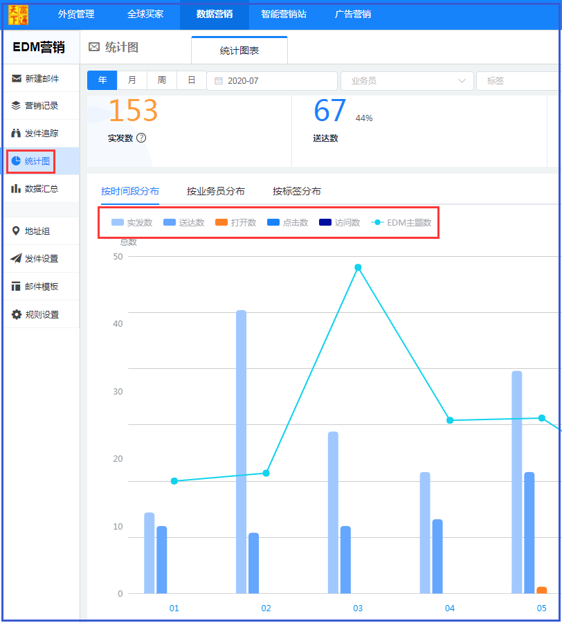 2、多方位掌控员工发件情况:按时间段、按业务员、按标签等图表化展现