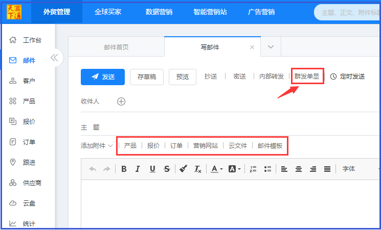正文编辑包含7种邮件插入形式:超大附件、邮件模板、海量产品、智能营销站、订单、报价、云文件