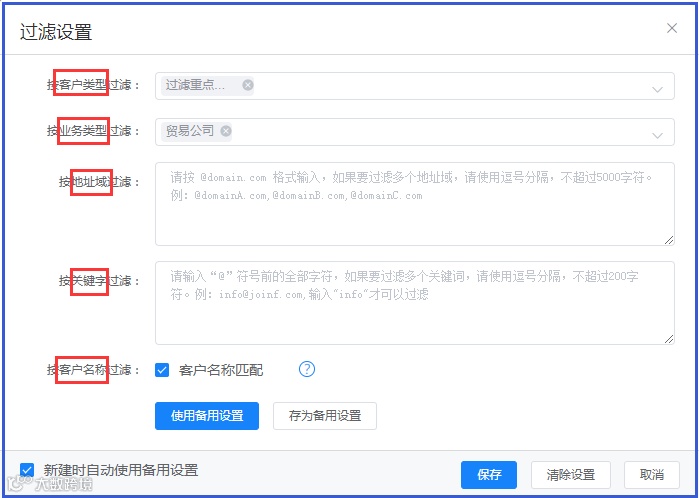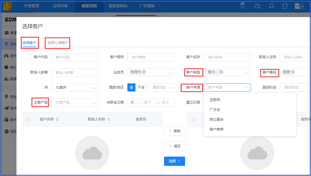 1、客户类型:可设置为重点客户、合作客户、潜在客户等类型,比如重点客户准备一对一进行跟进,不需要群发EDM,则可选择过滤客户类型:重点客户,则过滤所有重点客户属性的地址
