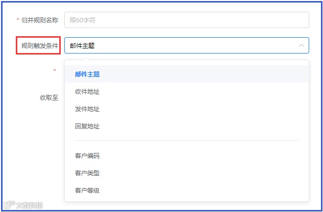 5、按照客户编码归并:比如客户编码为 123456,则包含该编码的所有来信自动归并至指定客户箱