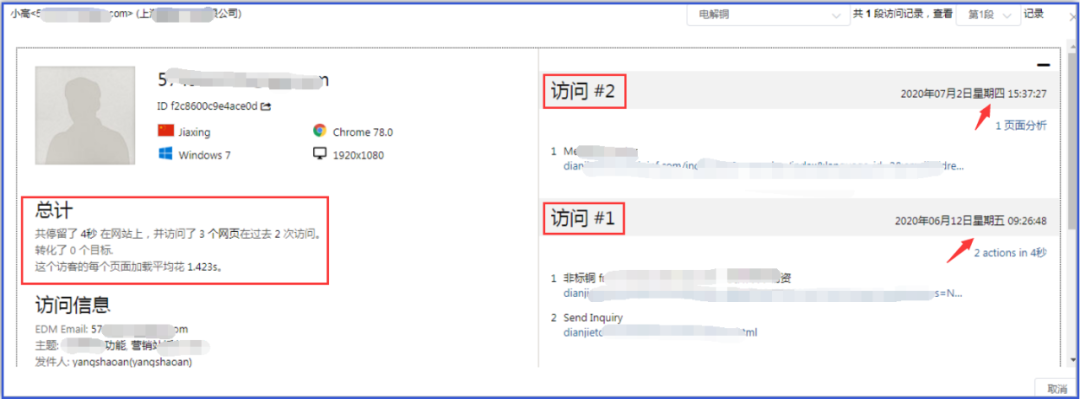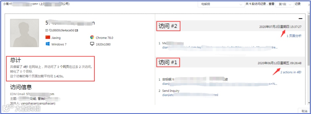 3、营销站访问明细:访问次数、时长、设备、停留时间、浏览页面、行为动作一应俱全