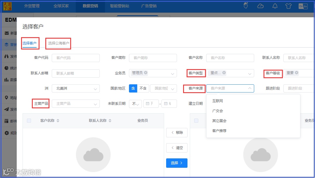 3、公私海客户:点击邮件编辑区的【选择客户】按钮,可在已有的库里导入客户地址,支持多种查询条件(如下图)