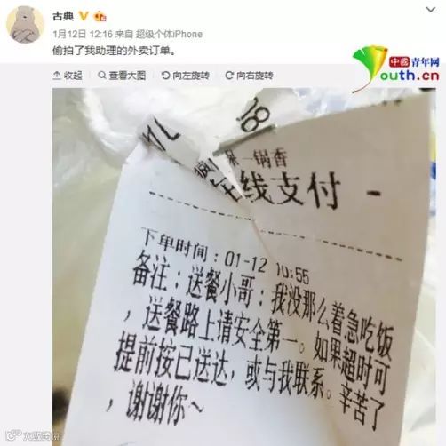 “送餐小哥:我没那么着急吃饭,送餐路上请安全第一。如果超时可提前按已送达,或与我联系。辛苦了,谢谢你…”1月12日中午,网友 @古典 在微博中晒出了一张外卖订单,因订单中的备注十分暖心而受到网友关注。图片发出后,网友们纷纷为这份相互体谅点赞。