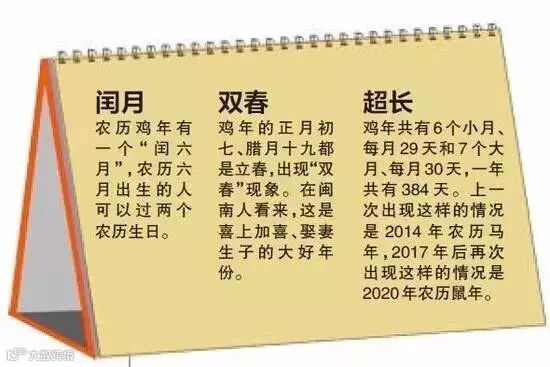 因为今年的农历鸡年是闰年,有一个“闰六月”,变成两个六月,才会导致一年有384天!下次出现这种情况的将在2020年。