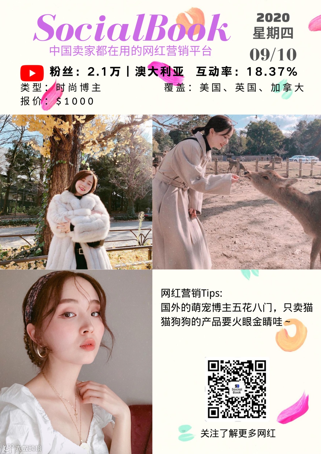 这个小清新范儿的博主是个亚裔女生,爱生活也会生活的她喜欢时尚,她的频道日常分享街拍、穿搭、姐妹聚会、下午茶时光、旅游,拍的图片都美美哒,让人感受到姐妹聚会的快乐,食物的美味及旅游的轻松惬意。在SocialBook300万+的网红库里,各种级别、各种类型的网红应有尽有,有了我们专业精准的大数据分析,能让你花最少的钱寻找到最具性价比的网红。快成为我们的会员吧,不要让自己输在海外营销的起跑线上哦!