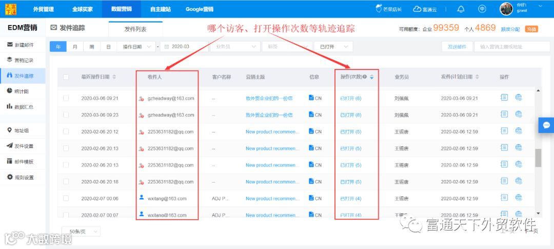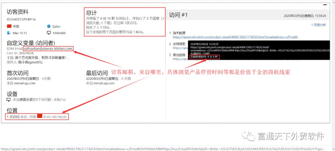 2、访客邮箱、打开邮件次数,每个痕迹都是你的宝贵商机线索;