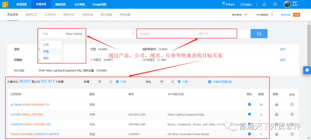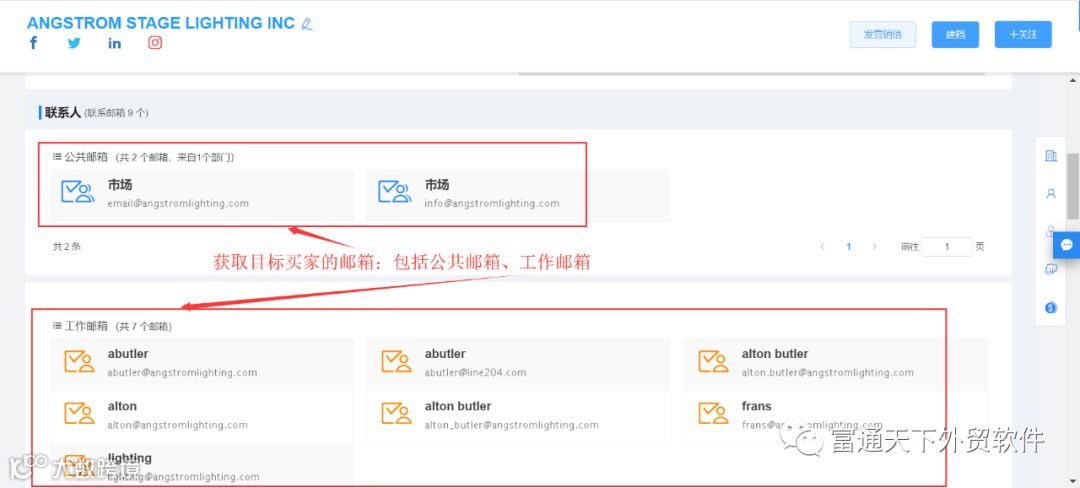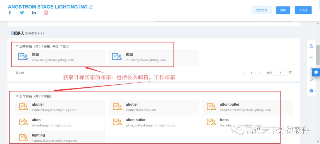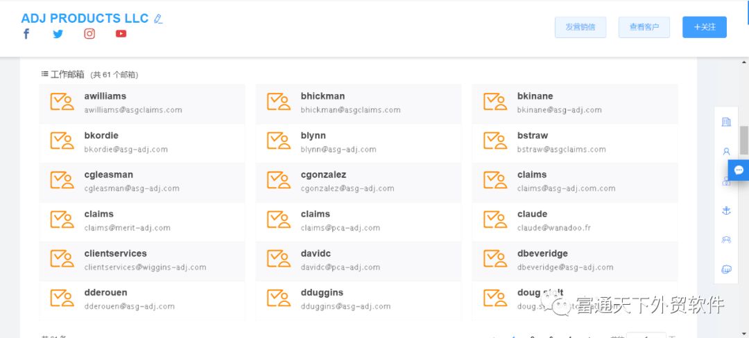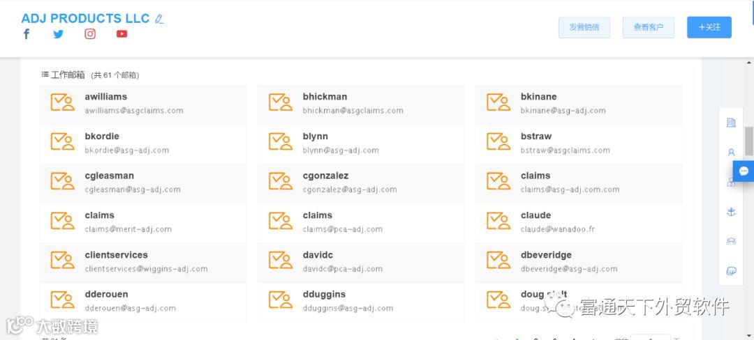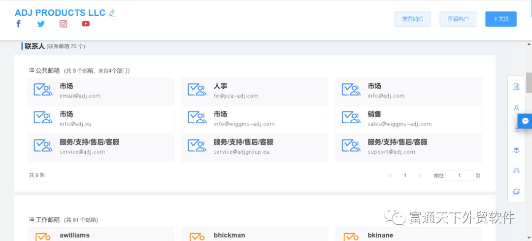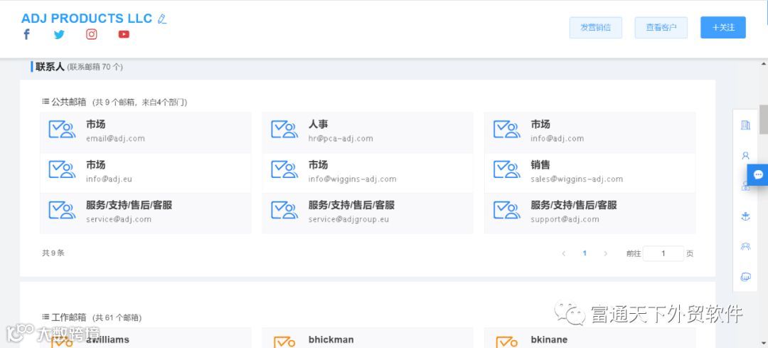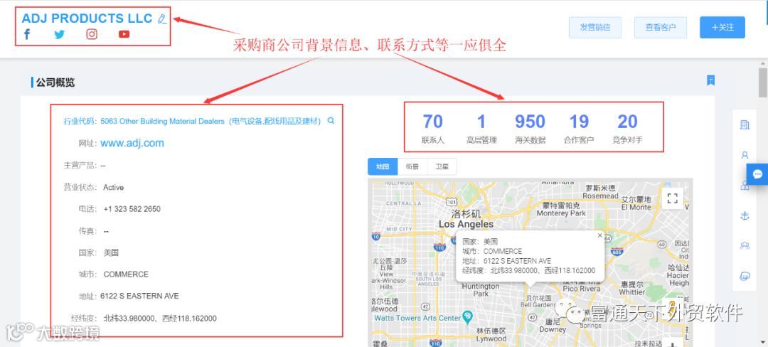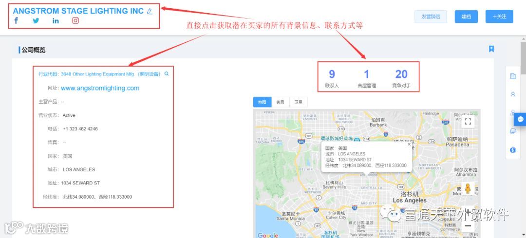 5、可以通过行业、产品核心词、国家等多维度快速查找,客户社交账号、网址、电话、邮箱等背景信息一应俱全。