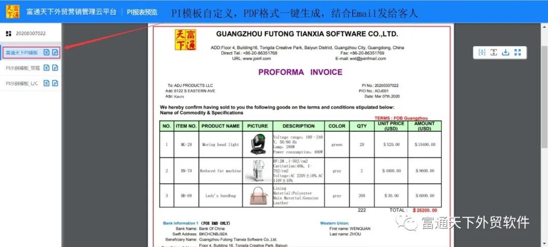 5、自定义PI合同模板,让你可以一分钟内生成PI订单,并可直接转化成PDF格式发送给客户;