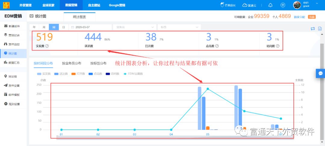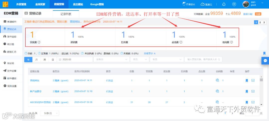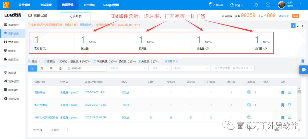 3、发件数、送达数、打开数、点击数、访问数,销售漏斗让你快速过滤出重点商机客户;