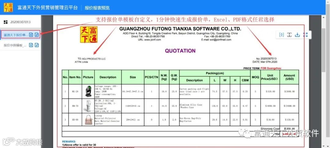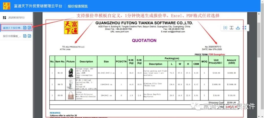4、自定义报价单模板,让你可以一分钟内生成QUOTATION,并可直接转化成PDF格式发送给客户;