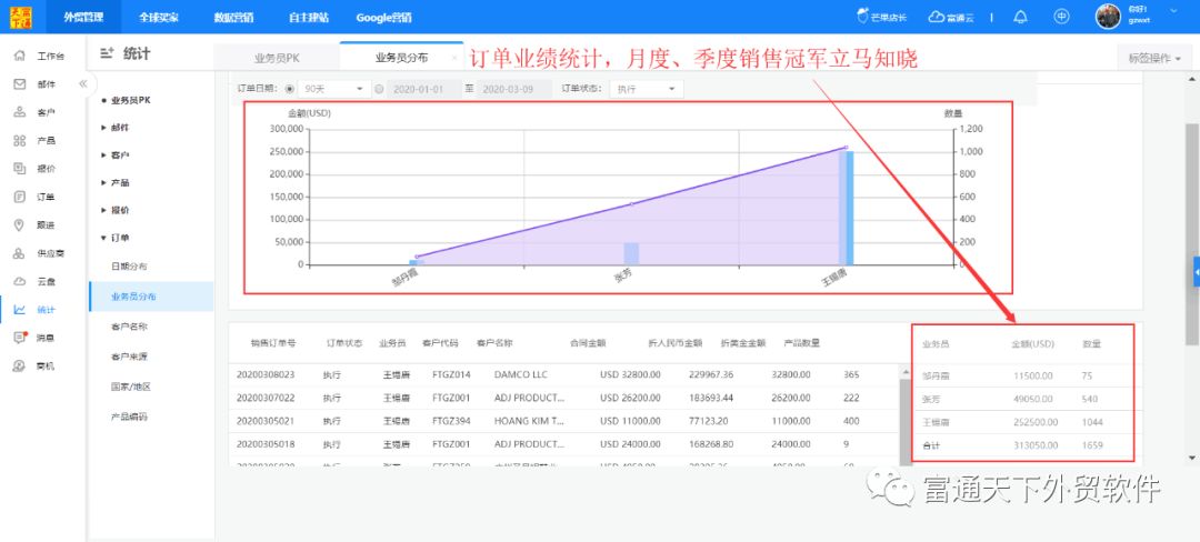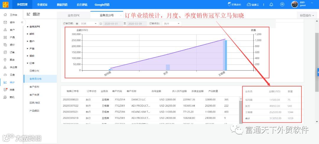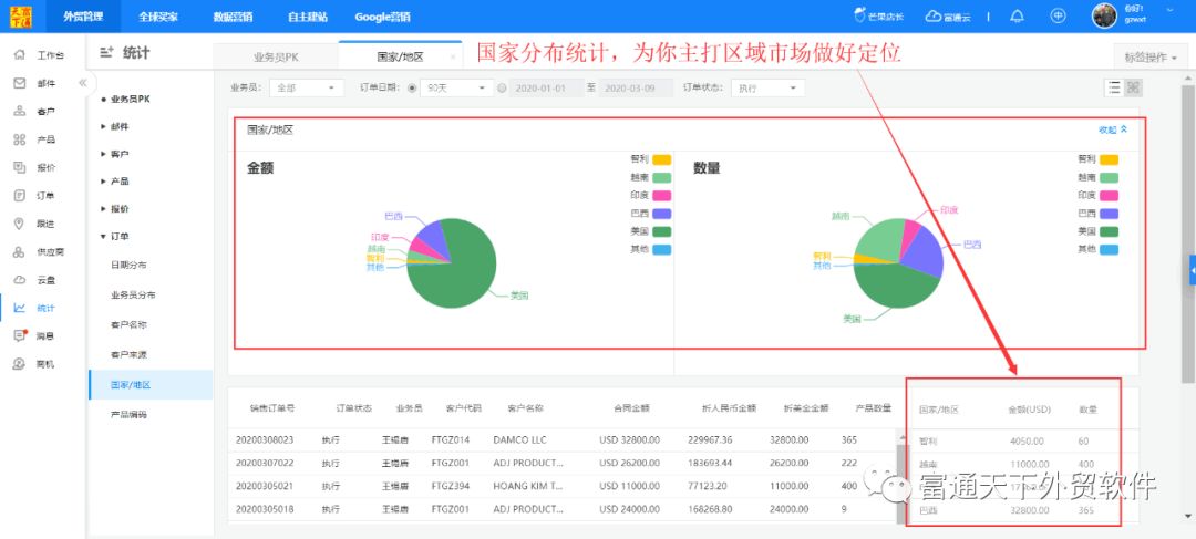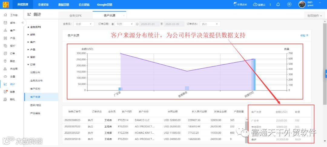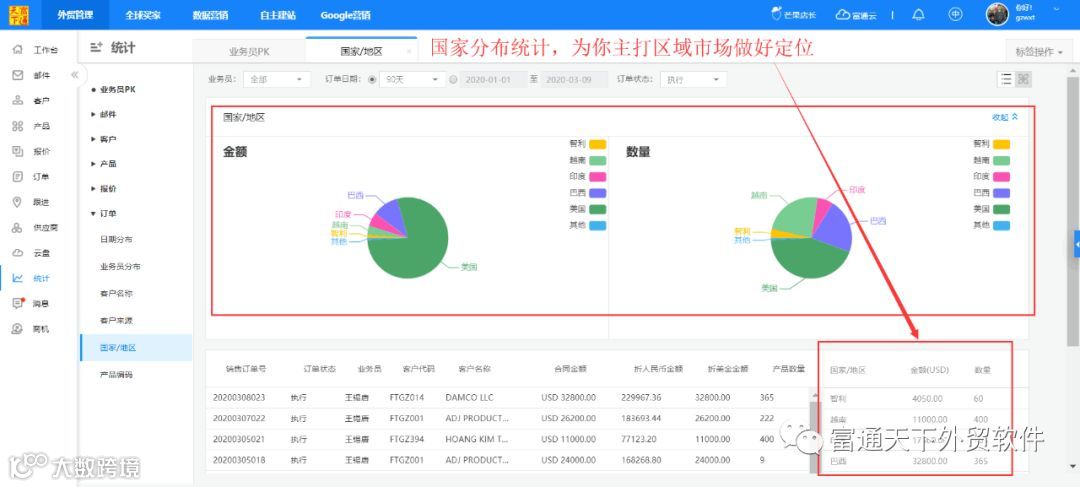 7、具体的业绩统计分析,让你了解团队业绩状况、客户来源分析、国家市场分析等,为你企业科学决策提供数据支持。