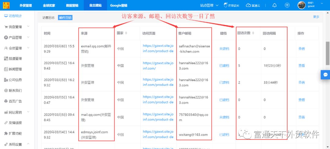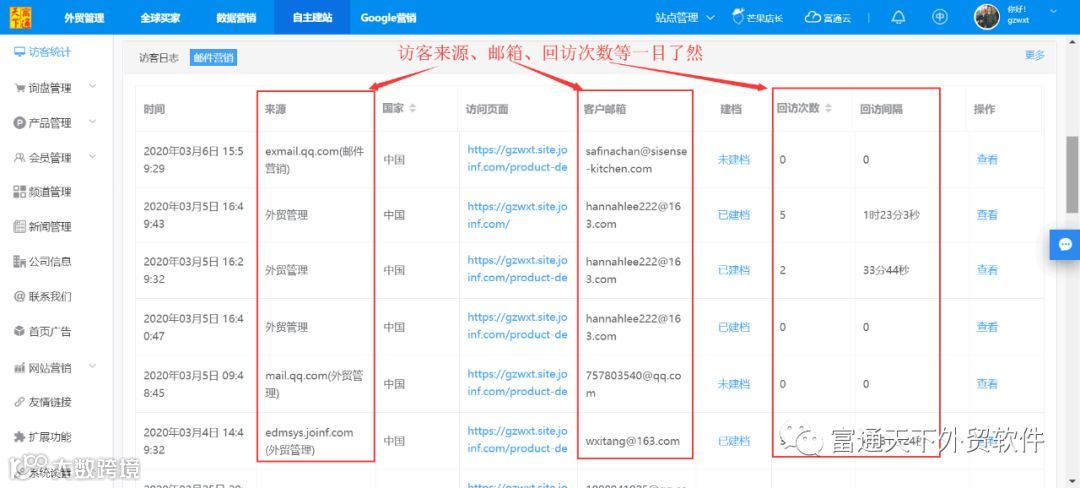 4、访客分析直接与客户邮箱打通,让外贸获取商机简单化;