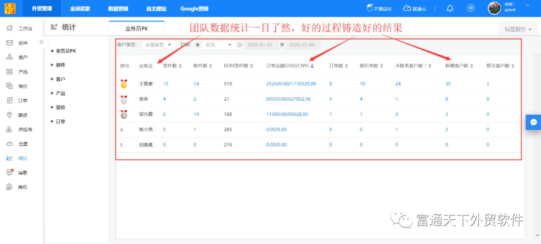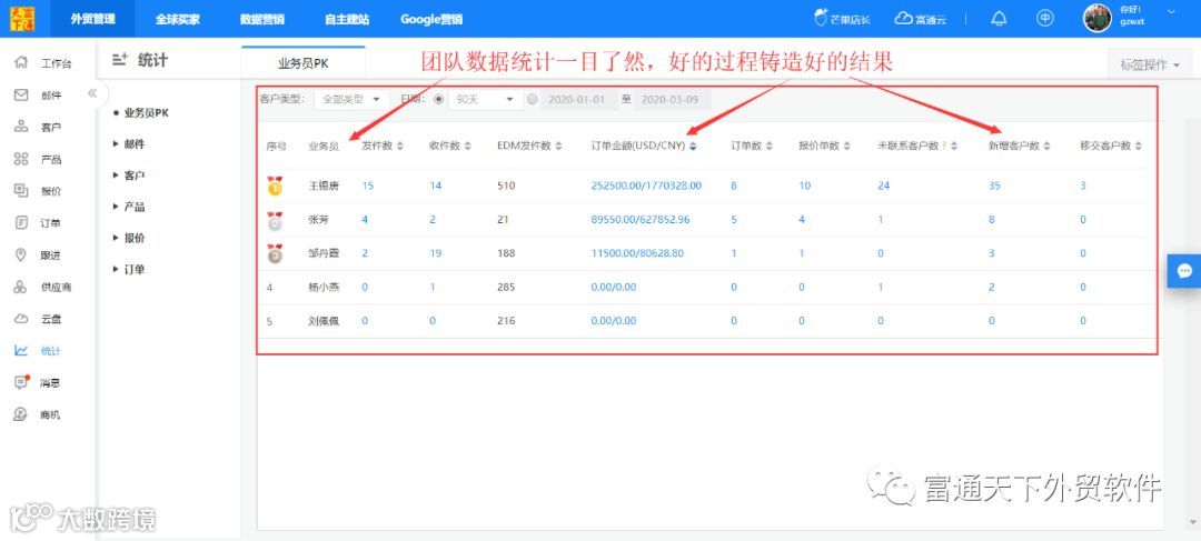 6、业务PK统计报告,让管理者的你一键了解整个团队的工作状态;