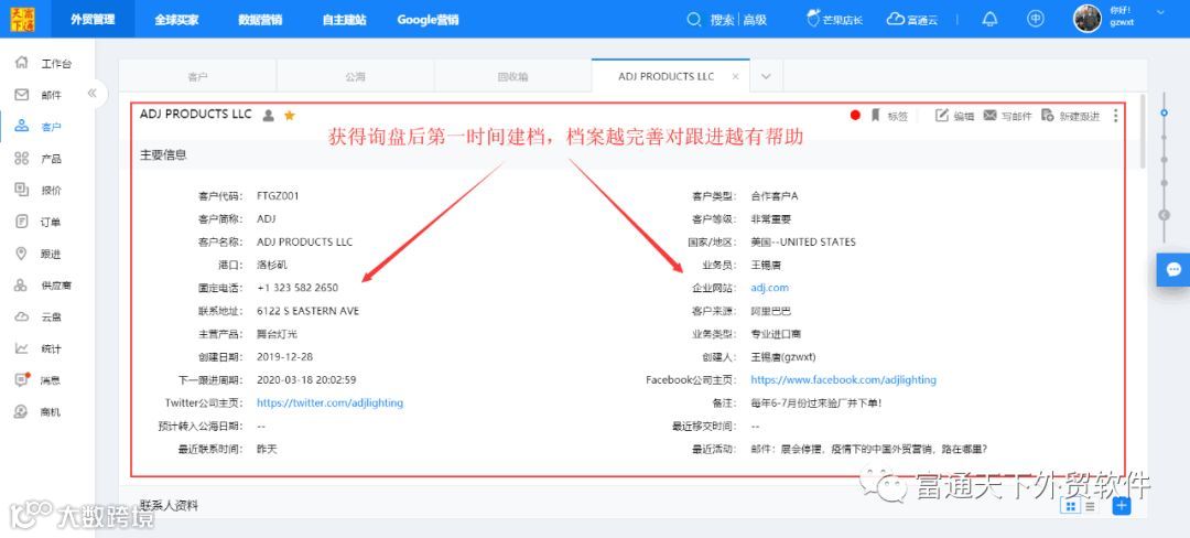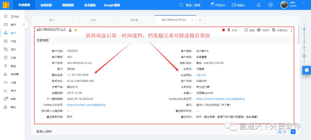 1、获得询盘商机后,第一时间建档跟进;
