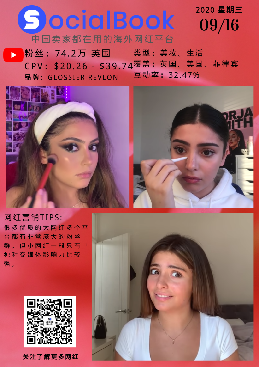 青春校园气息扑面而来的美少女,可盐可甜的各种装扮,有时候会和闺蜜一起为粉丝Show出上妆精彩全程。年纪不大,人气颇高,和粉丝的互动率很高。给了粉丝很多非常实用的彩妆介绍和日常好心情。这类中型网红的性价比很高,因为本身容貌上佳,活力十足,很容易用自身魅力打动粉丝跟从种草的心情。如果你还不知道怎么让自己的出海产品能够创造出更高的销量,一定要试试SocialBook网红营销了,这简直是现在最in的营销方式了,没有之一!