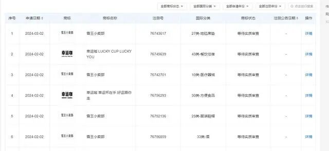 天眼查App显示,近日,蜜雪冰城股份有限公司申请注册多枚“雪王小卖部”“雪王优选”商标,国际分类包括服装鞋帽、布料床单、医疗器械等,当前商标状态均为等待实质审查。