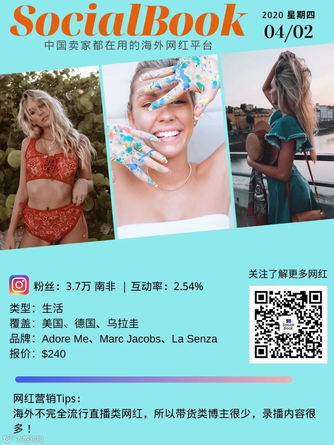 身处南非,身材很棒,颜值闪耀,她是一位Instagram的生活博主。她的美照大多分享旅行和户外活动,热爱去海边度假。阳关、沙滩和热情的生活瞬间,很多照片都得到粉丝的赞和评论。在SocialBook能够找到各种类型的博主,而生活博主就是那种万能的博主
