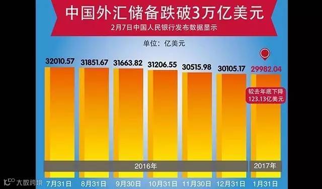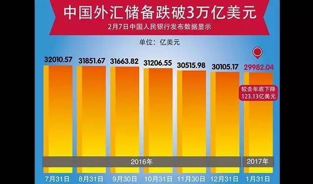 果不其然,此次最新数据显示,中国1月外汇储备29982亿美元,环比下降123亿美元,并且是连续第七个月下滑,至2011年2月来新低,这也是中国外汇储备近六年以来首次降到3万亿以下。