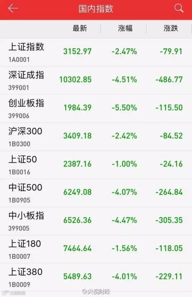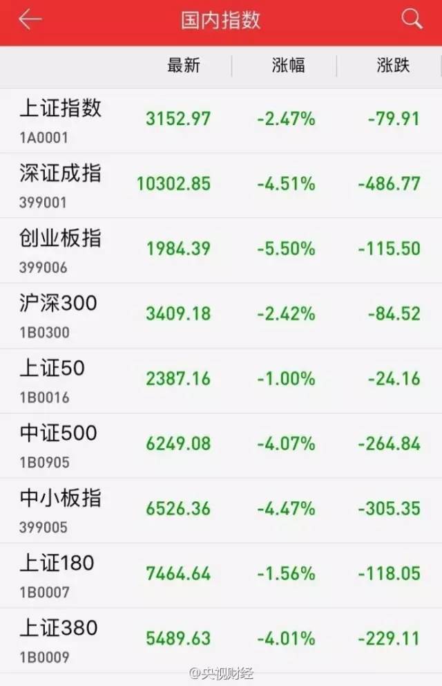 整个市场仅有100只左右的个股上涨,其余个股大面积杀跌,近200股跌停,1500只股票下跌超过5%。截至收盘,沪指报3152.97点,跌2.47%,深成指下跌4.51%,报收于10302.85点;创业板报1984.39点,跌5.50%。