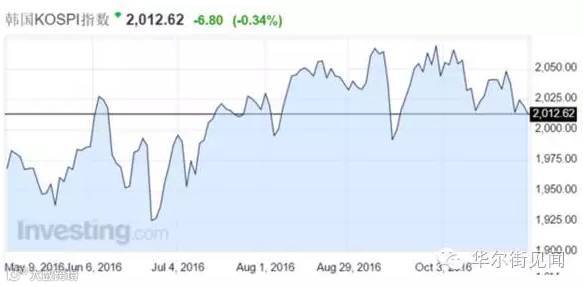 与她的支持率走势保持一致的是韩国股市的走势。上个月以来,韩国股市已经成为全球表现最差的股市。