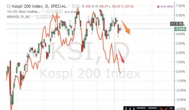 韩国政治风波对该国货币和股市产生压力,韩元(折线)和韩国股市(K线)上周双双下挫。