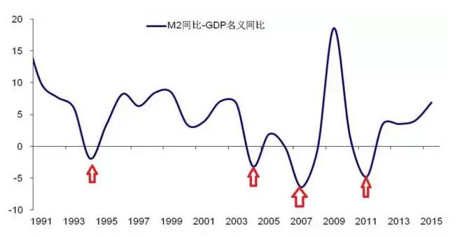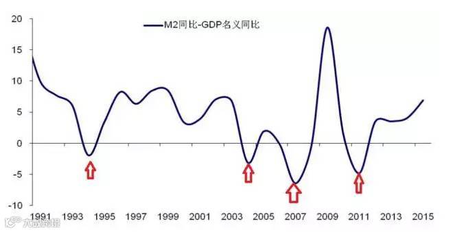 这里,我用M2减去名义GDP的数值来做分析,发现了一个特点:当数值接近零或为负值的时候,通常会出现通胀。用经济学理论来分析,通胀也是解释不通的:如果真的出现通胀,则表明中国的经济好了,也不需要“稳”增长了,因为CPI主要反映下游产业的价格上涨情况,PPI主要是反映上游价格的上涨情况,如果CPI涨起来,说明下游产业好了,那中国经济不就起来了吗?我们何苦还要去产能去库存呢?用同样的逻辑不能去解释相反的现象。