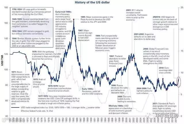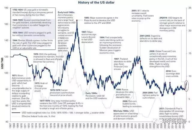 这和1985年的美元暴涨一样。最终美联储不得不跟随收益率陡升的走势,大幅攀升利率,紧缩债务,而对经济造成打击。随后,利率崩溃,美元也一泻千里。