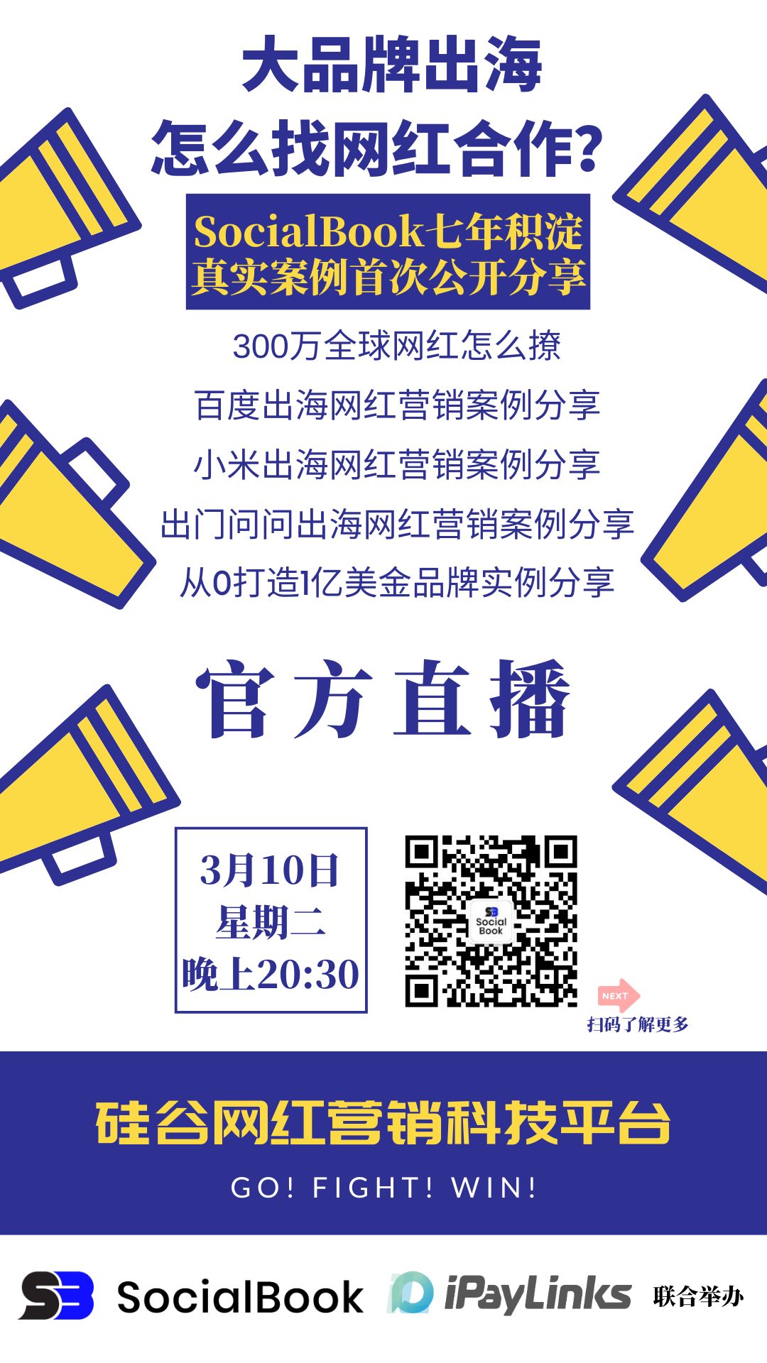 3月10日星期二晚上8点半,我们将在官网进行主题为《大品牌出海案例分享》的直播,为你揭秘七年来SocialBook所服务的典型出海大品牌投放网红营销的实际案例。本次甄选了百度、小米、出门问问三个国内大品牌出海案例,以及SocialBook从0到1亿美金打造海外品牌Fittea奇迹销售额的实操案例。