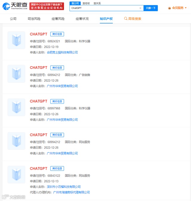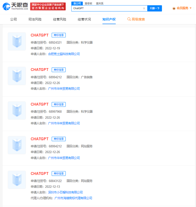 天眼查App显示,“CHATGPT”已被多方抢注商标,申请人包括深圳、合肥、广州、四川等地的科技、贸易公司及多名自然人,国际分类涉及广告销售、科学仪器、网站服务等,当前商标状态均为申请中。