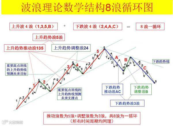 1、一个完整的循环包括八个波浪,五上三落;