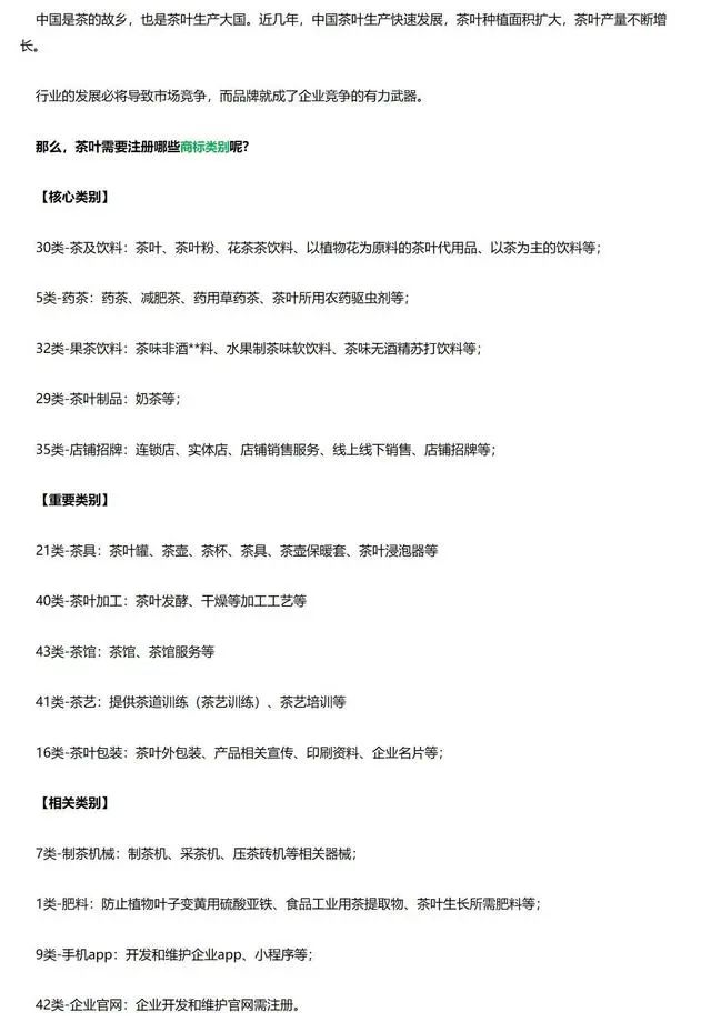 饮料类商标、茶叶类商标、茶叶制品类商标、茶叶配料类商标以及茶叶保健品类商标。