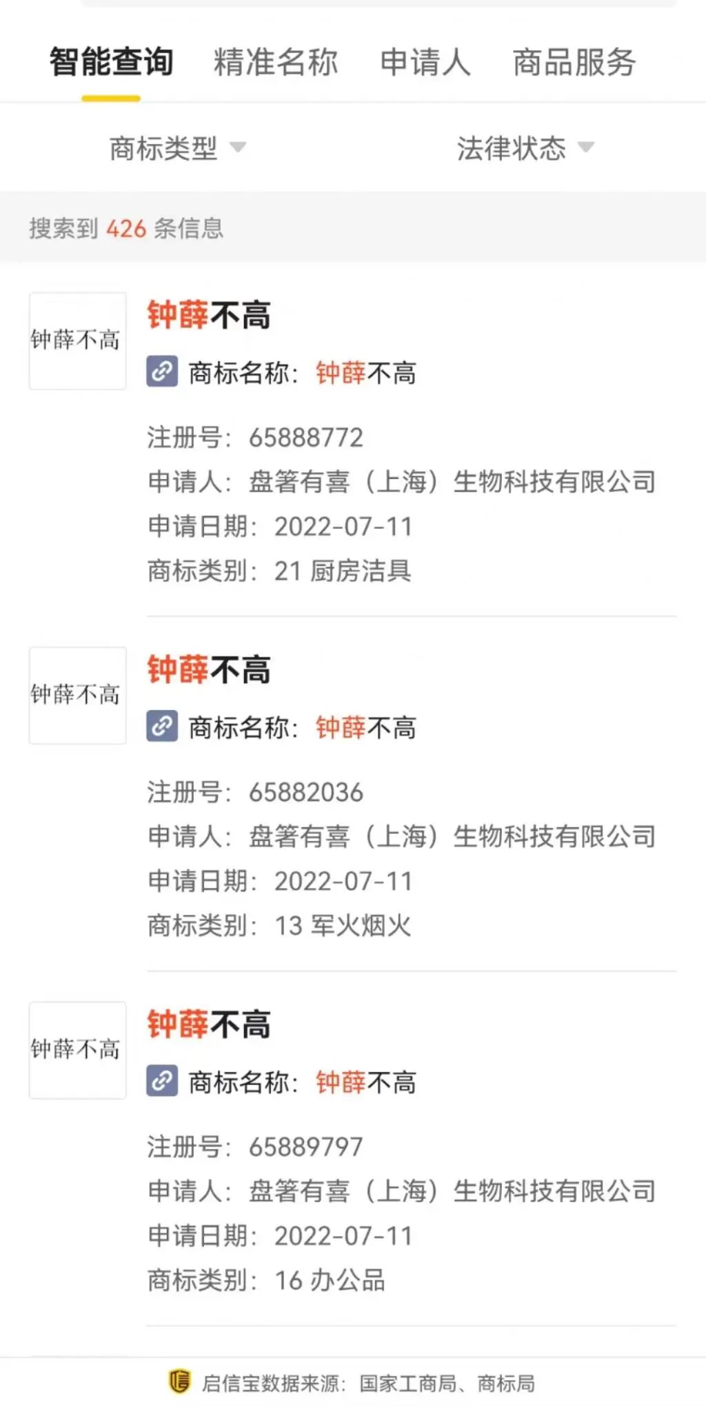 启信宝 App 显示,近日,盘箸有喜(上海)生物科技有限公司申请注册多个 " 钟薛低 "" 钟薛不低 "" 钟薛不高 "" 钟薛小高 "" 钟薛步步高 " 商标,含盖方便食品、啤酒饮料、教育娱乐、广告销售等 45 个国际分类。股东信息显示,该公司由钟薛高食品(上海)有限公司全资持股。