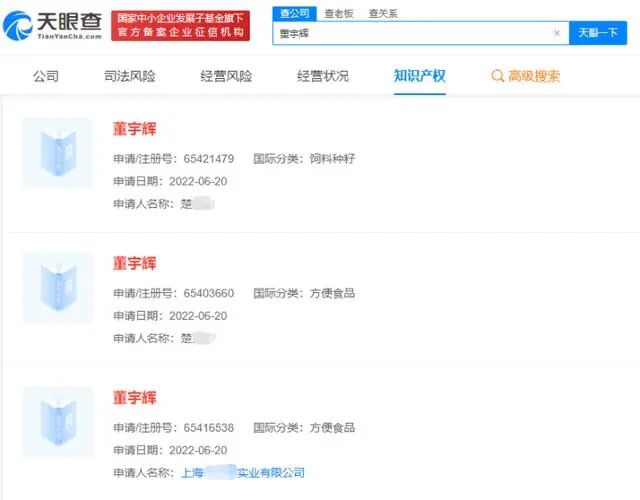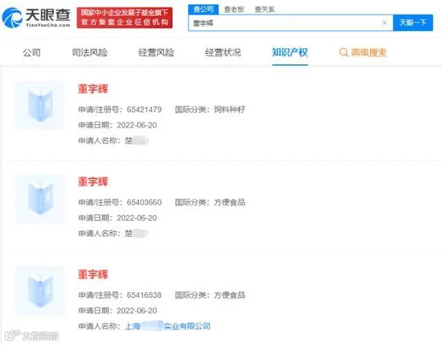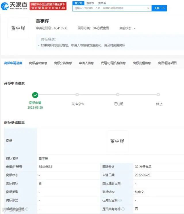 最近,随着东方甄选知识式直播带货的走红,主播董宇辉也被更多人注意到。6月29日,据天眼查显示,“董宇辉”商标近日被上海博润腾实业有限公司、自然人楚克坤申请注册,国际分类包括咖啡、茶、米面、巧克力、糕点甜食等,查询商标详情显示:此商标正等待受理,暂无法查询详细信息。