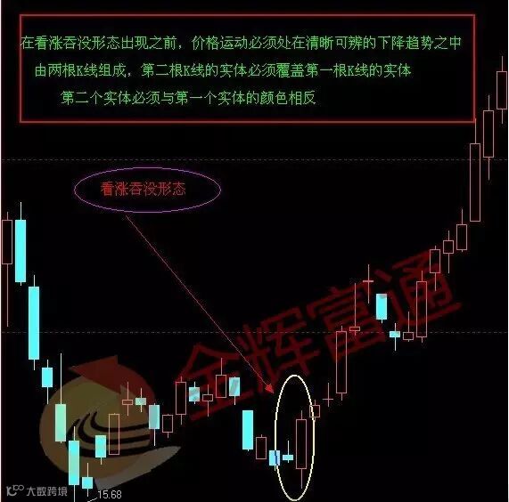 以现货白银为例,银价处于下降趋势中,但后来出现了一根坚挺的实体,这根实体将它前面的那根实体“抱进怀里”或者说把它吞没了。这种情形说明市场上买进的力道已经压倒了卖出的力道。