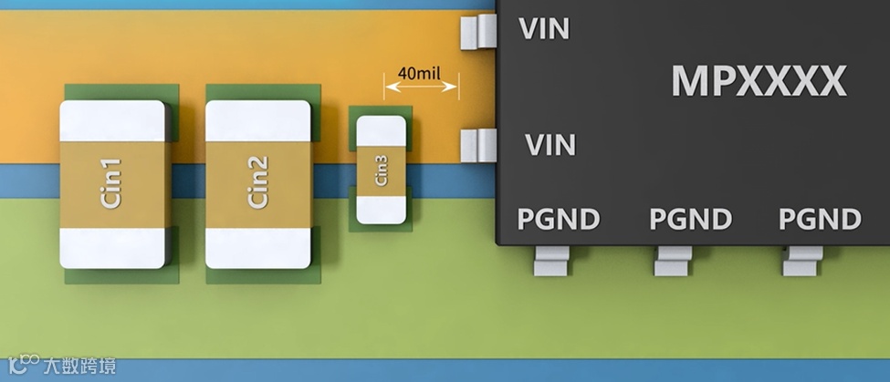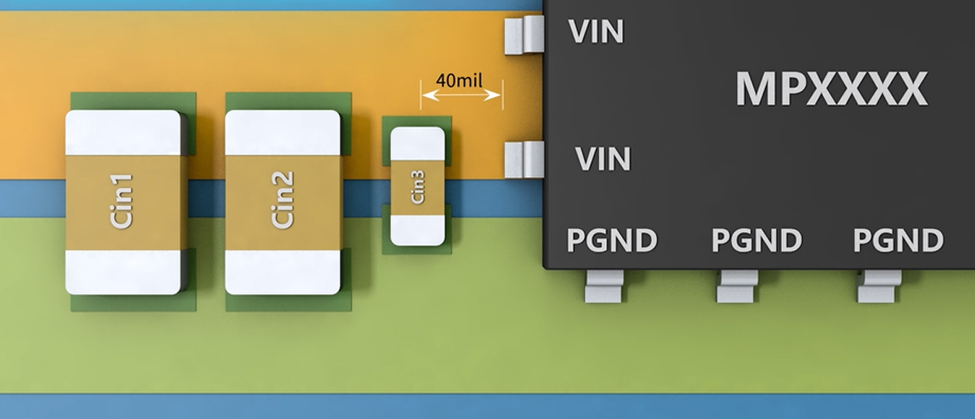 需就近放在芯片的输入Vin和功率地PGND,来减少寄生电感的存在。因为输入电流不连续,寄生电感引起的噪声可能会超过芯片的耐压以及对逻辑单元造成不良影响。VIN管脚旁边至少要有1个去耦电容,距离最好小于40mil,用来滤除来自电源输入端的交流噪声和来自芯片内部(倒灌)的电源噪声,同时也会起到储能作用。