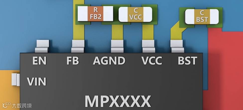 一般包括FB上下分压电阻和前馈电容。由于FB点的电压很低,普遍在0.6-0.8V左右,极易与噪声或纹波混淆,是芯片最敏感,最容易受干扰的部分,也是引起系统不稳定的常见原因。所以在布线时,上下分压电阻和前馈电容都尽量靠近芯片摆放来减少噪声的耦合,FB电阻连接到FB管脚的走线要尽可能地短来减小寄生电感以及阻抗。同时,需要注意FB连接到Vo的走线可以通过过孔设置在其他层,但也要尽可能远离噪声源,如SW、BST、电感等。