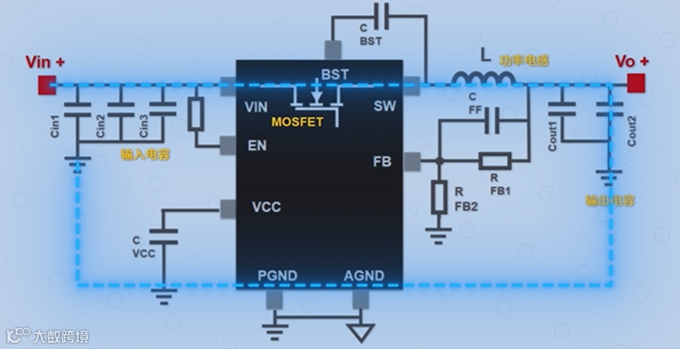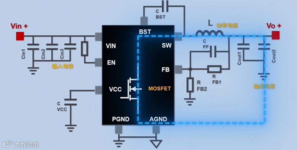 在buck电路中,一般需要注意以下几个逻辑环节:自举电容、反馈电路、VCC和单点接地。