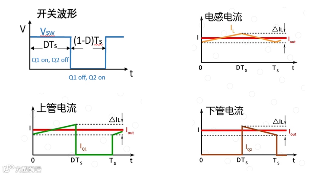 结合上管和下管,即Q1、Q2的电流波形(图1(c)),不难发现,只有在两个开关管的部分会出现高电流转换速率。由于PWM信号处电压的快速变化,SW点会产生较强的噪声。所以我们在PCB布线时需要特别注意,尽可能减小这一快速变化环节的面积来减少对其他部分的干扰。可喜的是,随着集成工艺的进步,目前大部分电源芯片都将上下管集成到了芯片的内部,只有较少数的应用需要外置MOS或是二极管。