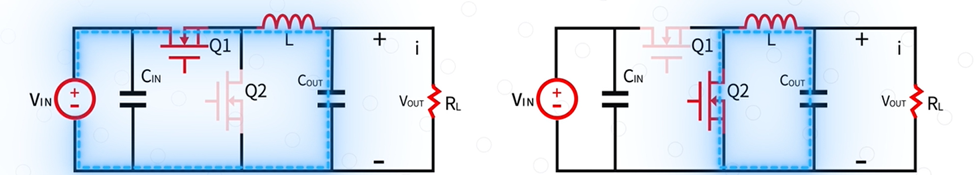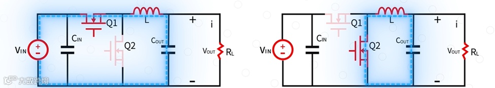 如图1(a)和1(b) 展示的分别是上管开通和关断时的电流回路,即我们通常说的功率回路部分。这部分电路负责给用户负载供电,承受的功率较大。电路中的上下管一般使用MOS管,由芯片内部产生的PWM信号来控制他们进行高速的开断。而后半部分电路中的电感和电容组成了一个LC滤波电路,故不会存在一个较高的电流变化趋势。