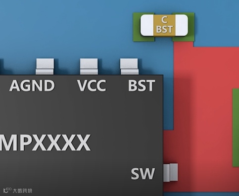 中高压buck芯片内部集成的上管一般都为NMOS,故需要BST自举电路。在电感放电期间,通过对自举电容进行充电,在BST管脚处就会产生一个高于SW的电压,在电感充电期间驱动上管。故BST与SW一样,也是一个电压高速跳变的点,会辐射出较强的噪音。自举电容也要放置在尽可能靠近BST和SW的位置,避免对其他信号的影响,布线时宽度一般在20mil即可。