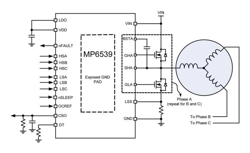 MP6539 专为三相无刷直流电机驱动器应用设计,能够驱动由六个 100V N-通道功率 MOSFET 组成的三个半桥。它支持 100V 工作电压、120V VBST 最大电压,具备 0.8A/1A 驱动和灌电流能力;支持电池供电应用的低功率休眠模式,Isleep 休眠电流 ≤1μA;拥有可调节的死区时间控制、可编程过流保护(OCP)、故障指示输出等关键功能;提供 TSSOP-28(9.7mmx6.4mm)和QFN-28(4mmx5mm)两种封装形式可供选择。