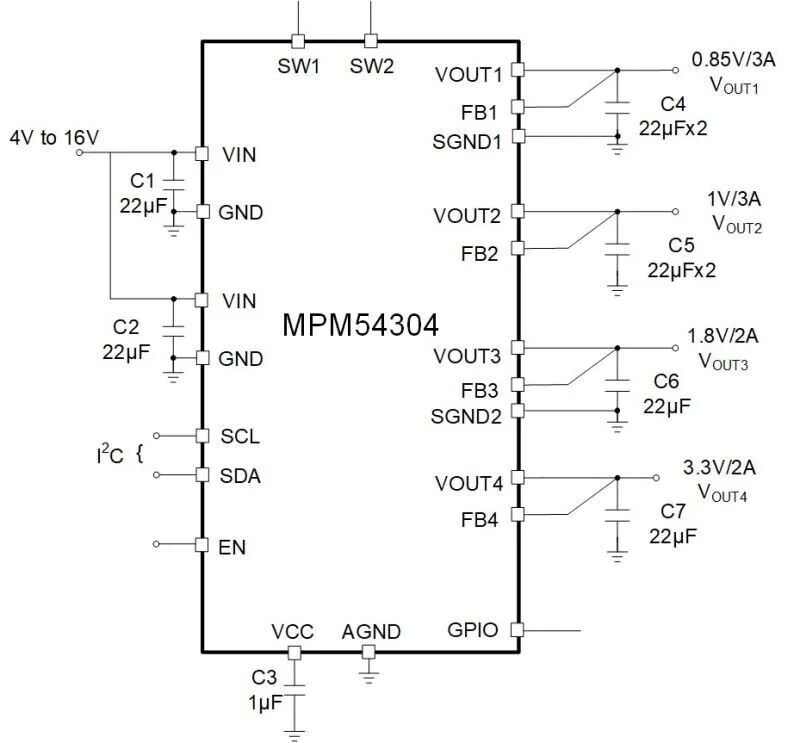 MPM54304 电源管理模块集成了降压 DC/DC 变换器、电感和逻辑接口,最大限度减少了外部元器件的使用数量。该模块支持 3V - 16V 的宽输入范围和 0.55V - 5V 的宽输出范围,输出电压可通过 I2C 总线进行调节。MPM54304 的通道 1 和 2 可提供 3A 连续电流,支持并联;通道 3 和 4 可提供 2A 连续电流,支持并联。该器件采用节省空间的 LGA(7mmx7mmx2mm)封装。